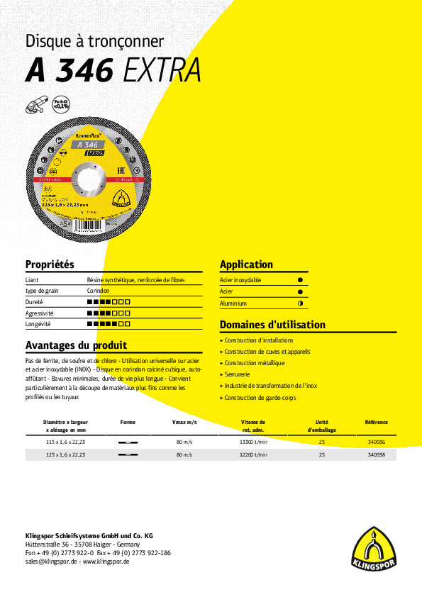 | 222954 | 340938 | Disque A 346 Extra | 125 x 1,6 mm | Acier/inox/alu |