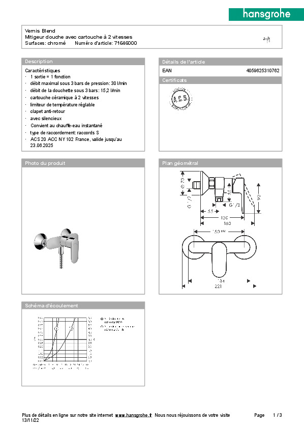 | 74207 | 71646000 | Mitigeur douche Vernis Blend | Fixe | Chrome | Mural |