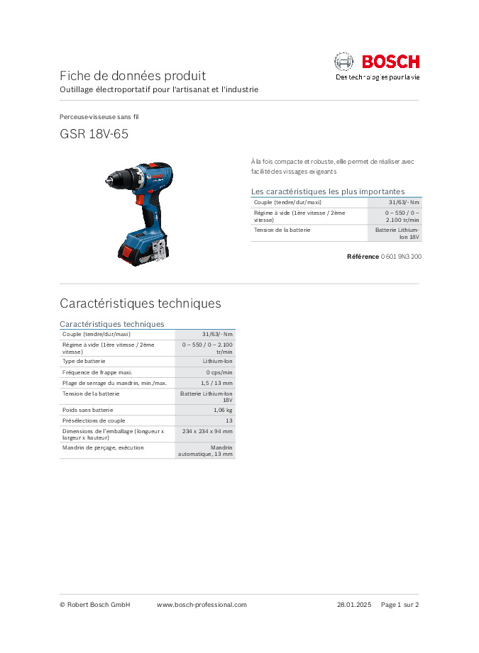 | 85396 | 06019N3203 | Perceuse visseuse GSR 18V-65 + 2 batt. + chargeur | Oui | 18 V |